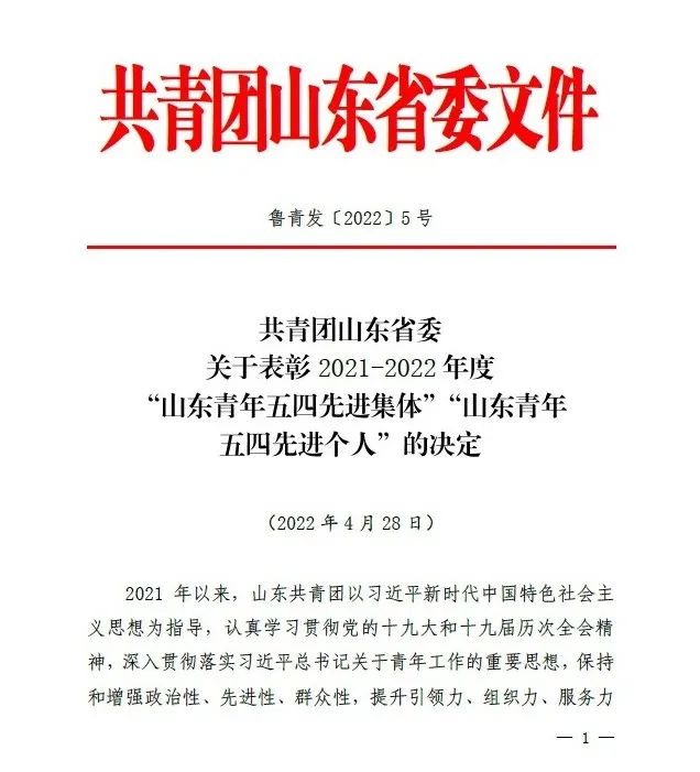 近日,共青团山东省委公布《关于表彰2021-2022年度“山东青年五四先进集体”“山东青年五四先进个人”的决定》,雷火竞技官方网站团委荣获“山东省五四红旗团委”荣誉称号。